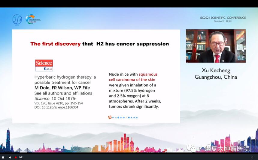 基于已有的理論與實(shí)踐,他提出設(shè)想:如果先吸入氫氣激活衰竭衰老的免疫細(xì)胞,再與腫瘤細(xì)胞冷凍后釋放的抗原相遇,結(jié)果會(huì)產(chǎn)生協(xié)同效應(yīng),也許能更大程度強(qiáng)化免疫功能,改善治療后的情況,從而延長患者的生存期。徐院長表示,目前臨床上有一些非常成功的案例,但仍需進(jìn)一步觀察,希望在第22屆ISC世界大會(huì)上報(bào)告一系列臨床研究的結(jié)果。