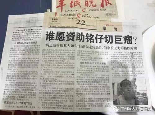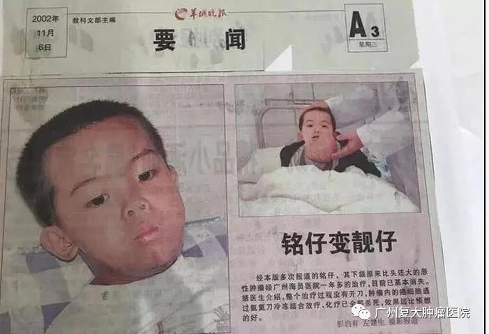 看到新聞的徐克成榮譽總院長派出醫(yī)務(wù)部主任和護士,驅(qū)車300公里,半夜到達粵西銘仔的家,將銘仔接來廣州為他免費治療。“當時我被奶奶抱著,就坐在老家的門檻上等著車來接?!便懽谢貞浀喇敃r病情惡化,高燒、頭暈、呼吸困難,身上插滿了管子,迷迷糊糊看到醫(yī)護人員在他身旁守著、護著。在經(jīng)過介入、放療、熱療、冷凍消融等綜合治療,銘仔的巨瘤得以控制。2002年11月6日,羊城晚報刊登《銘仔變靚仔》的報道,向社會宣告了銘仔治療取得初步成功的好消息。