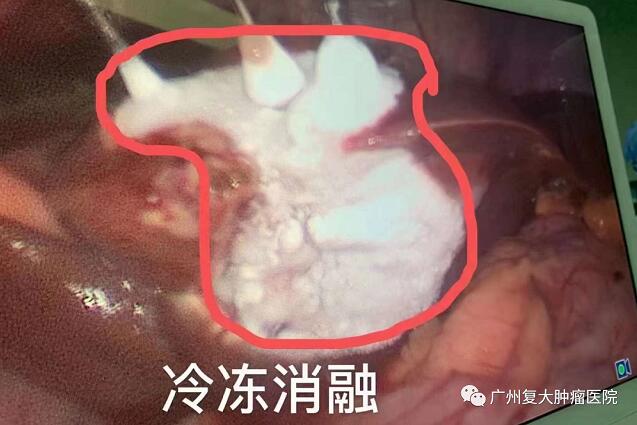 “腫瘤上面是膈肌,下面是胃,這種情況是無法熱消融的。這種情況,腹腔鏡的精確引導(dǎo)準(zhǔn)確鎖定腫瘤組織,把膈肌和胃拉開,暴露腫瘤位置,再進(jìn)行冷凍消融比較安全?!迸A⒅驹洪L解釋道,冷凍消融治療重復(fù)的冷凍-復(fù)溫過程可有效殺滅腫瘤細(xì)胞、微血管內(nèi)膜損傷并栓塞、逆轉(zhuǎn)腫瘤免疫抑制狀態(tài),達(dá)到較好控制腫瘤進(jìn)展的目的。