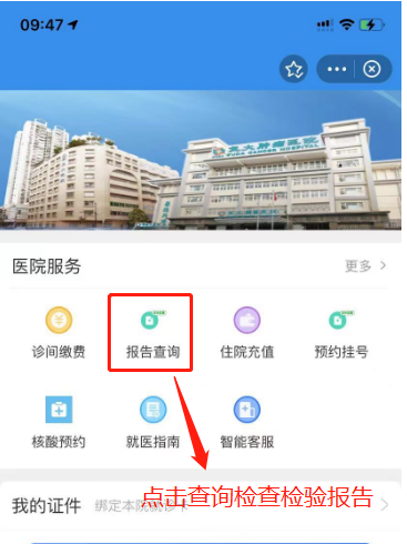點(diǎn)擊報告查詢→選擇就診卡→選擇需要查詢的報告。