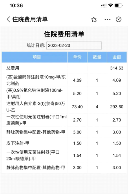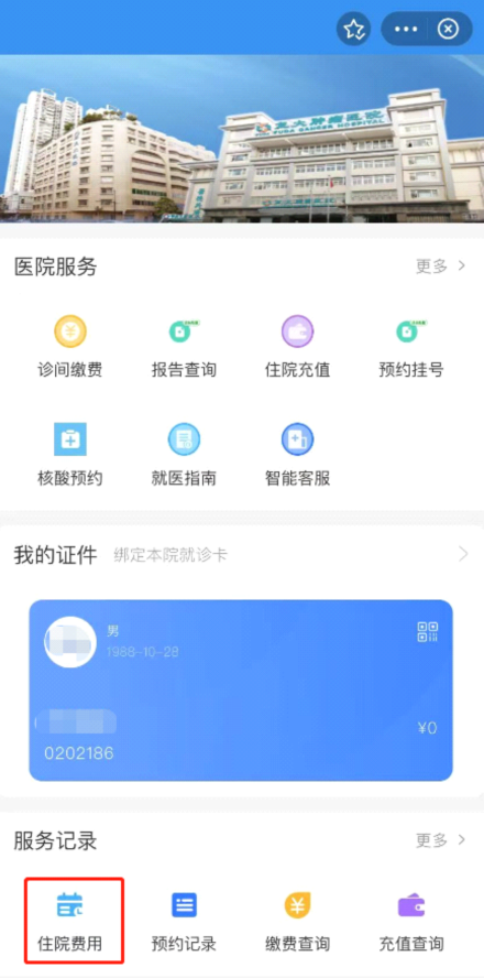 住院費(fèi)用→選擇已綁定患者的電子診療卡→選擇需要查詢的費(fèi)用日期(默認(rèn)當(dāng)前日期)。
