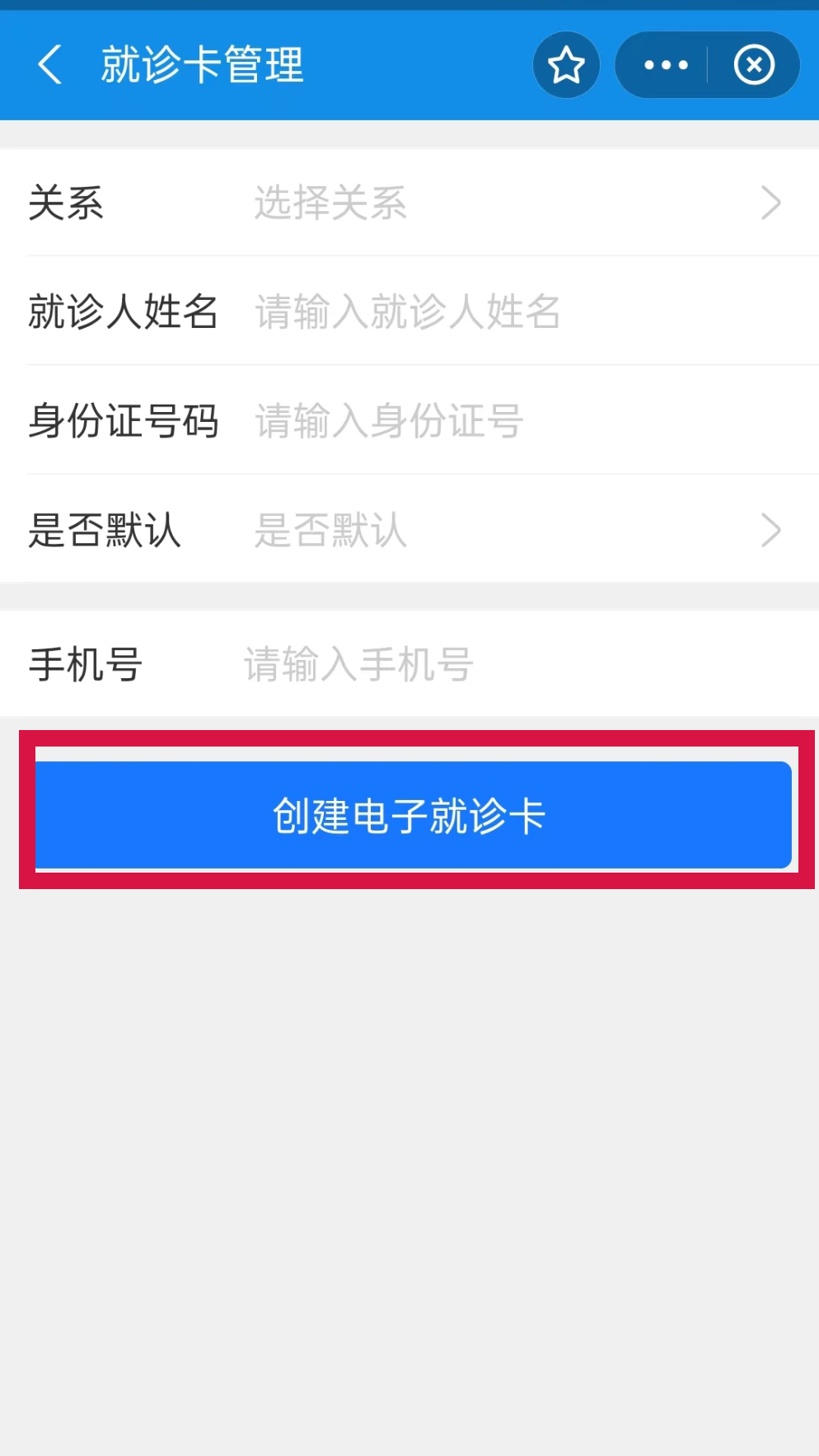 點(diǎn)擊創(chuàng)建/綁定就診卡→創(chuàng)建電子就診卡,輸入相關(guān)信息,完成電子就診卡綁定